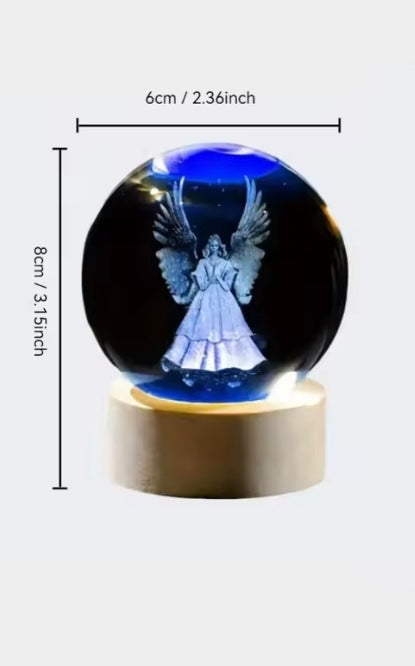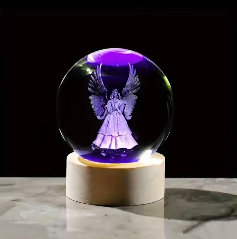 Een prachtig stukje hemelse kunst — deze glazen bol met houten voet vangt het licht van het geloof op een unieke en stijlvolle manier.