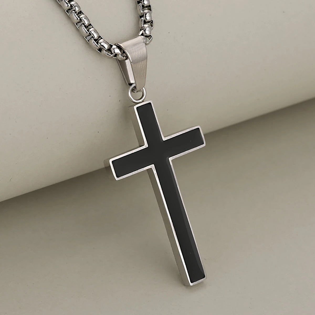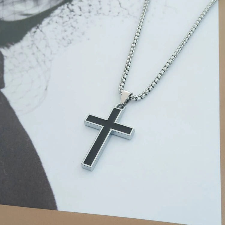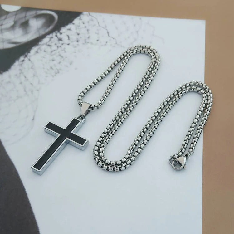 Een stijlvolle kruishanger ketting voor mannen, gemaakt van hoogwaardig roestvrij staal. Deze trendy ketting combineert een stoere uitstraling met een betekenisvol symbool van geloof.