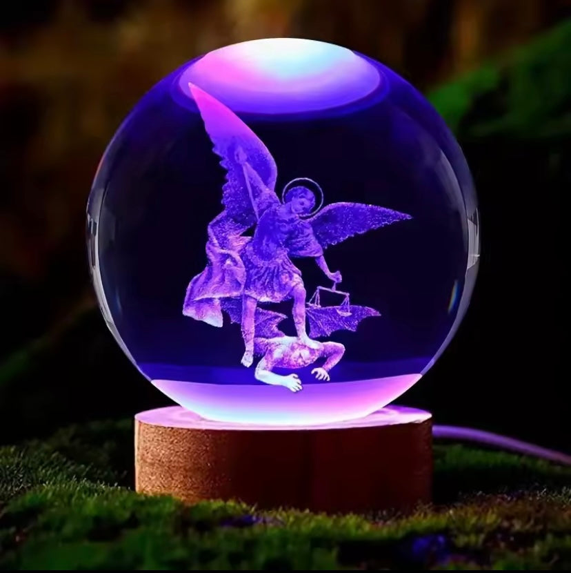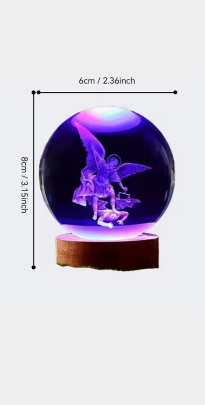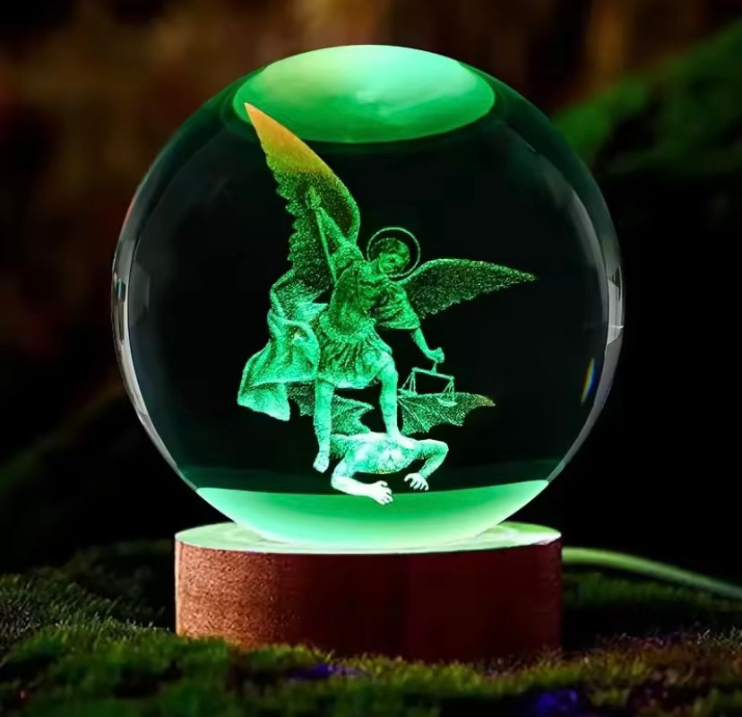 Een prachtig stukje hemelse kunst — deze glazen bol met houten voet vangt het licht van het geloof op een unieke en stijlvolle manier.